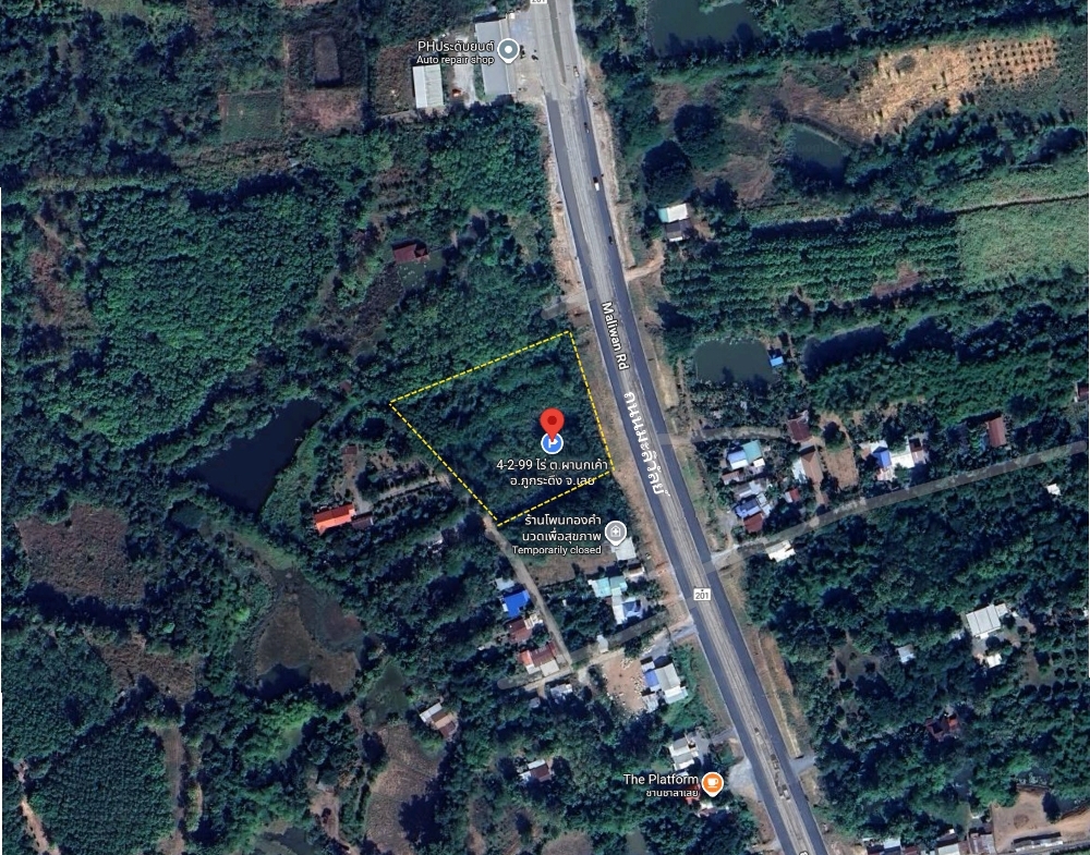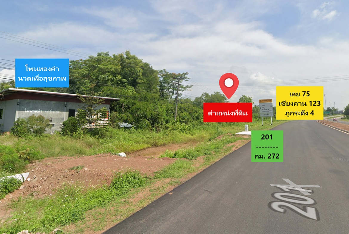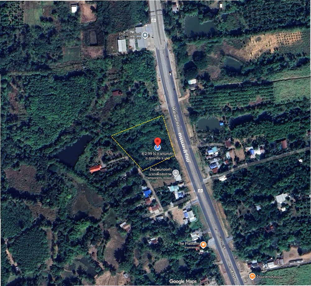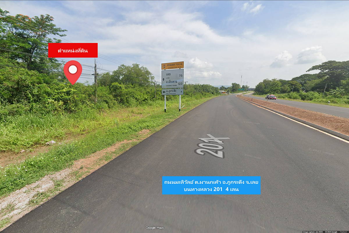 ที่ดิน 4-2-99 ไร่ (1,899 ตรว.) ถ.มะลิวัลย์ ต.ผานกเค้า อ.ภูกระดึง จ.เลย ผืนสี่เหลี่ยมสวย ริมถนนทางหลวงหมายเลข 201 ห่างจากสามแยกคนดี เพียง 650 เมตร ซึ่งตรงไปยัง ภูกระดึงได้ทันที ตารางวาละ 5,000 บาท